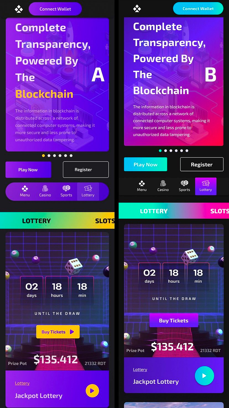 Gaming App UI: The art team retooled the Gaming App UI by playing with different color pallets. What do you like better the lemon colors on the left or the purple/pink cyan colors on the right?